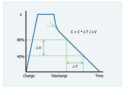 根据EDLC测试法规IEC 62391,在测试容量前,EDLC必需确定其 经过CV充电程序并且已经完成充电后,其容量测试是以上述放 电电流进行CC放电,放电程序完成后,取放电曲线上EDLC之额 定电压的80%电压点及额定电压的40%电压点,二点间的放电能 量与间距时间,来计算此EDLC的容量。