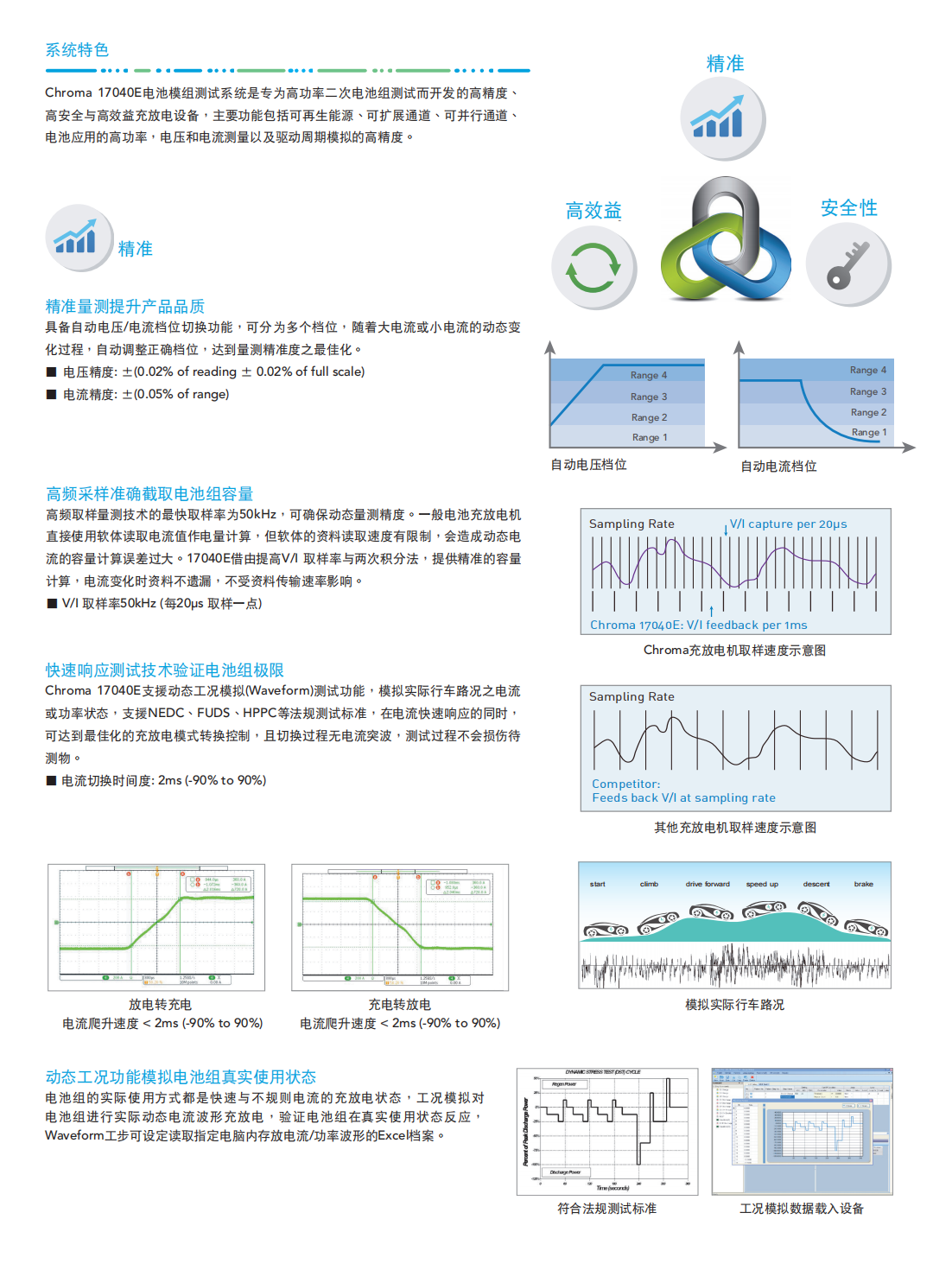 Chroma 17040E电池模组测试系统是专为高功率二次电池组测试而开发的高精密充放电设备,具有能源回收功能,可节省放电过程所消耗的大量电能,即使动态充放电,也能确保电网端维持稳定,不致因谐波污染影响其他设备。