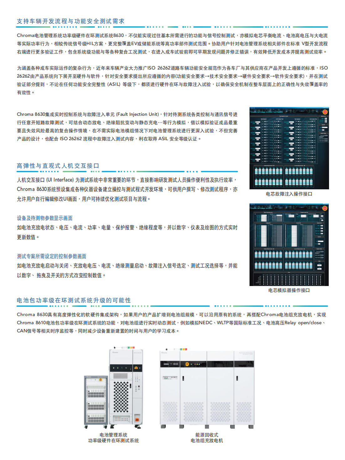 Chroma推出新型电池管理系统功率级硬件在环测试系统,具备电池管理系统相关零部件特性的设备,包括电池芯模拟,电池组电压与电流模拟,温度信号模拟,并提供多样化的硬件选择进行集成,如直流电源供应器、数位电表、绝缘测量仪等。