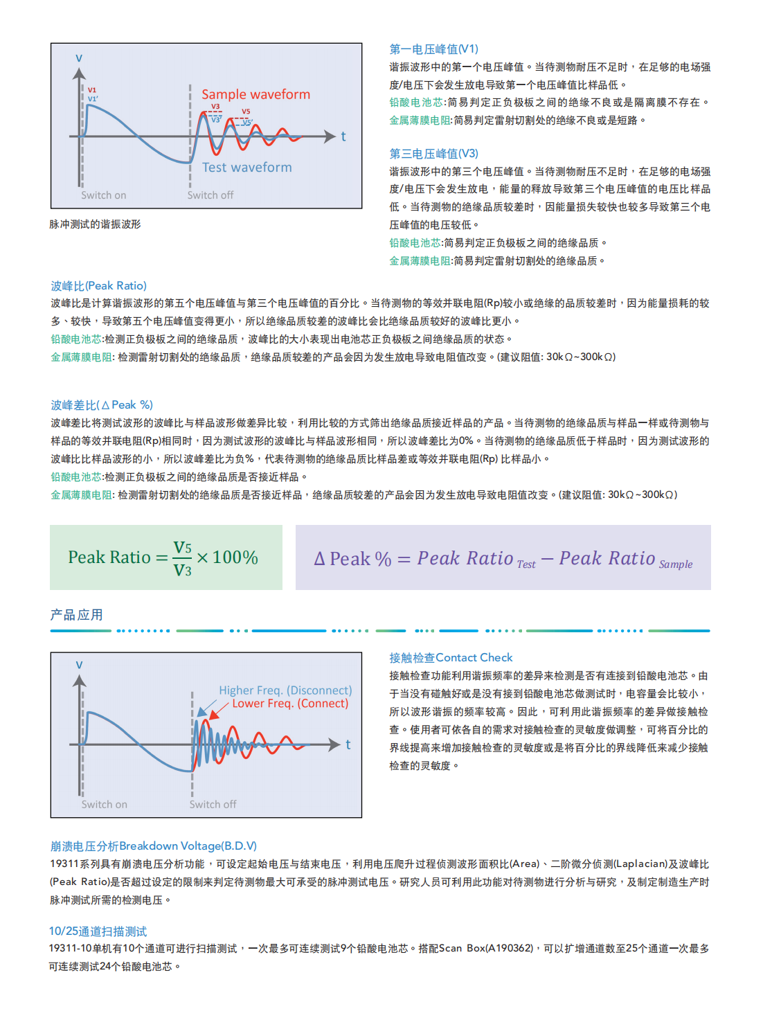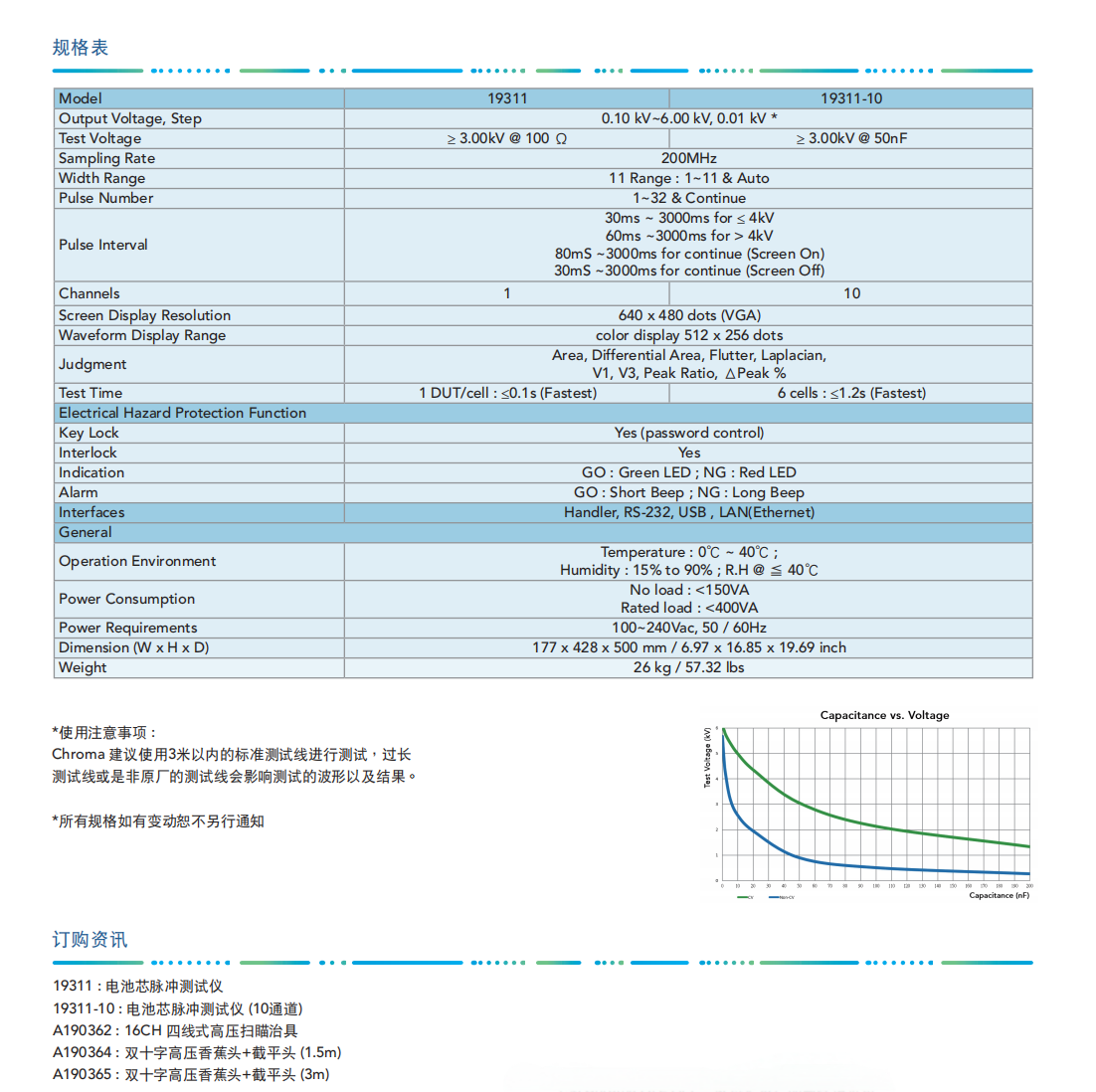 Chroma 19311系列脉冲测试仪可对尚未注入电解液的铅酸电池芯施加高压脉冲来检测正负极板之间的绝缘品质以及对金属薄膜电阻施加高压脉冲来检测雷射切割处等的绝缘品质。