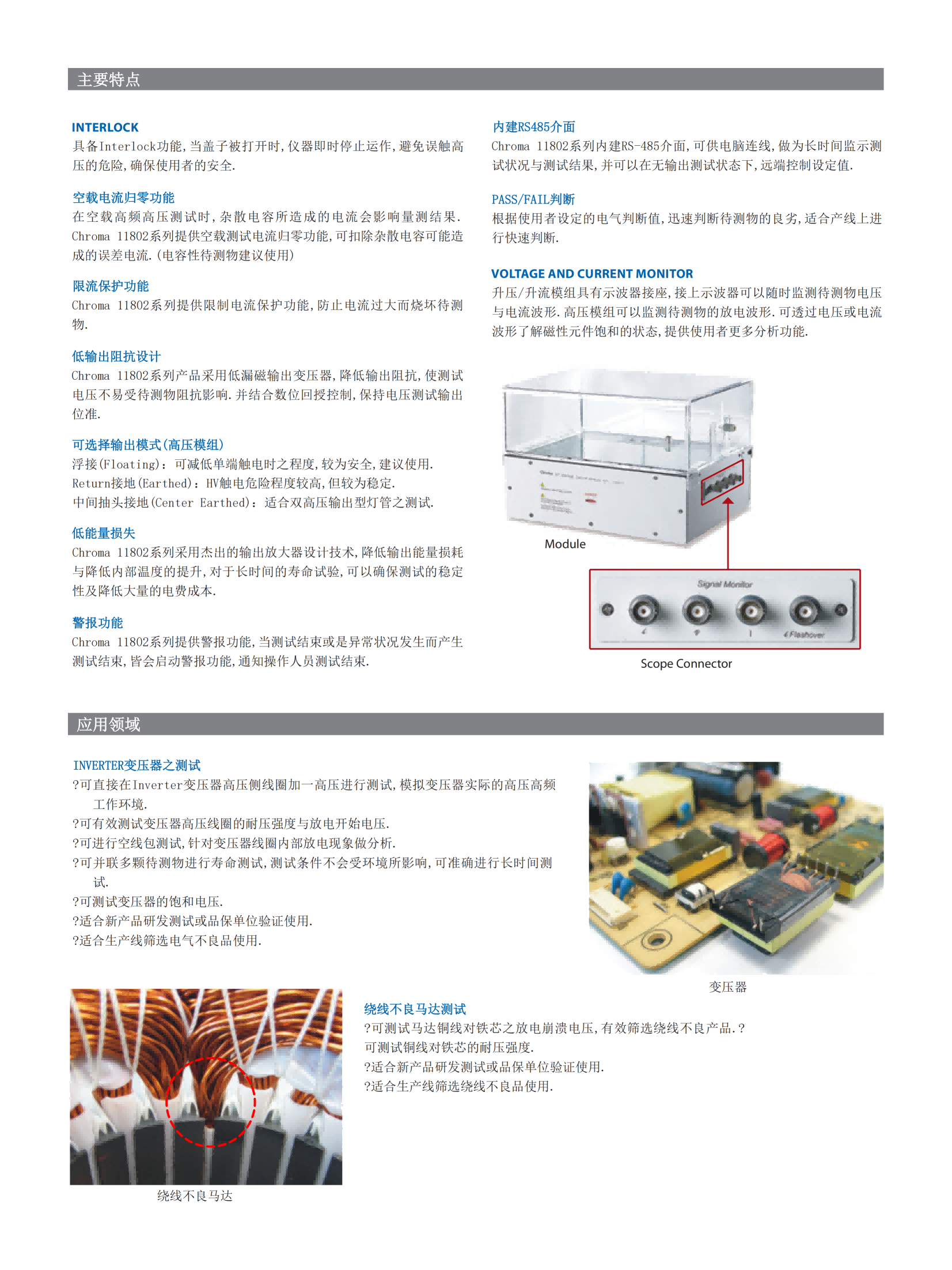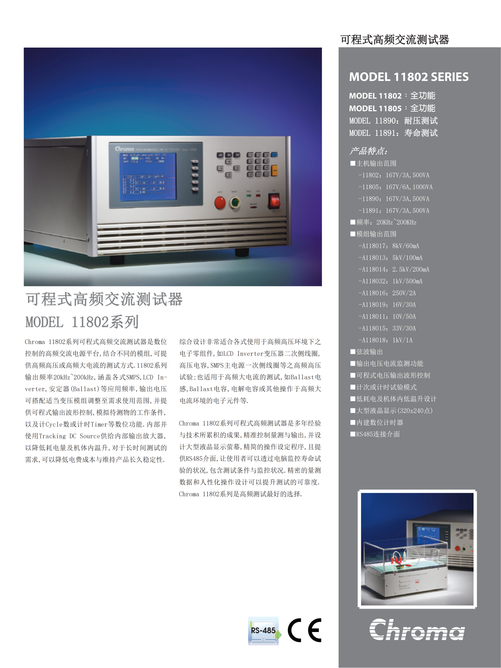 Chroma 11802系列可程式高频交流测试器是数位控制的高频交流电源平台,结合不同的模组,可提供高频高压或高频大电流的测试方式。